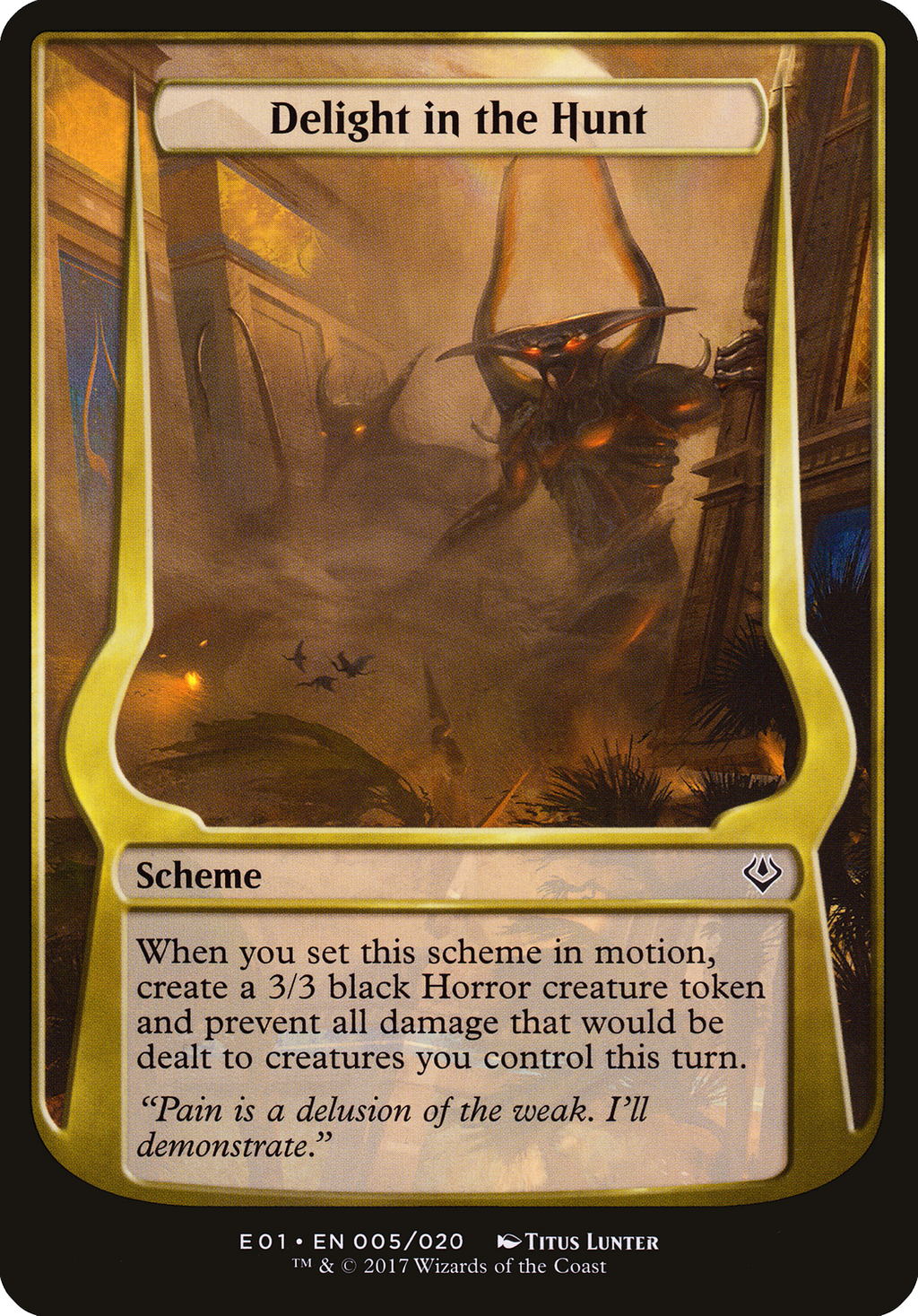 When you set this scheme in motion, create a 3/3 black Horror creature token and prevent all damage that would be dealt to creatures you control this turn.
